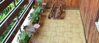 A hátsó fedett terasz járólappal burkolt, alatta egy száraz, tiszta 25m2-es pince található.