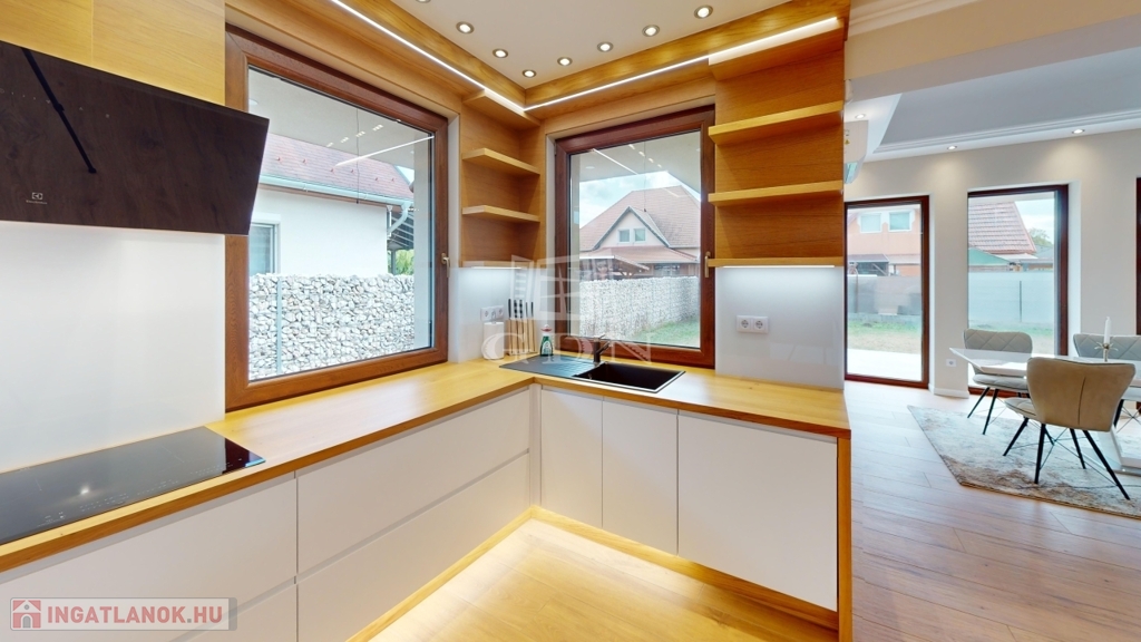 • Nyílászárók: 82mm-es profilvastagság, 3 rétegű üveg, gázzal töltve, dió RAL színű műanyag ablakok, vele megegyező színű elektromos alumínium redőny + beépített szúnyogháló