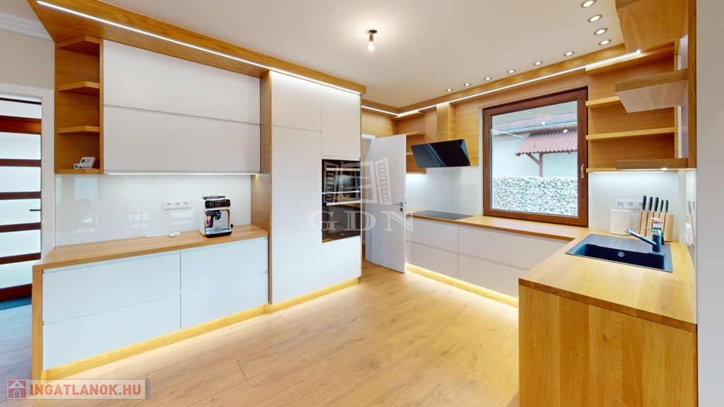 • Konyhabútor: AEG, Whirlpool, Electrolux beépített gépekkel, led világítással, tömör fa munkalappal, Blum vasalattal, Blanco gránitmosogató, Blanco csaptelep.