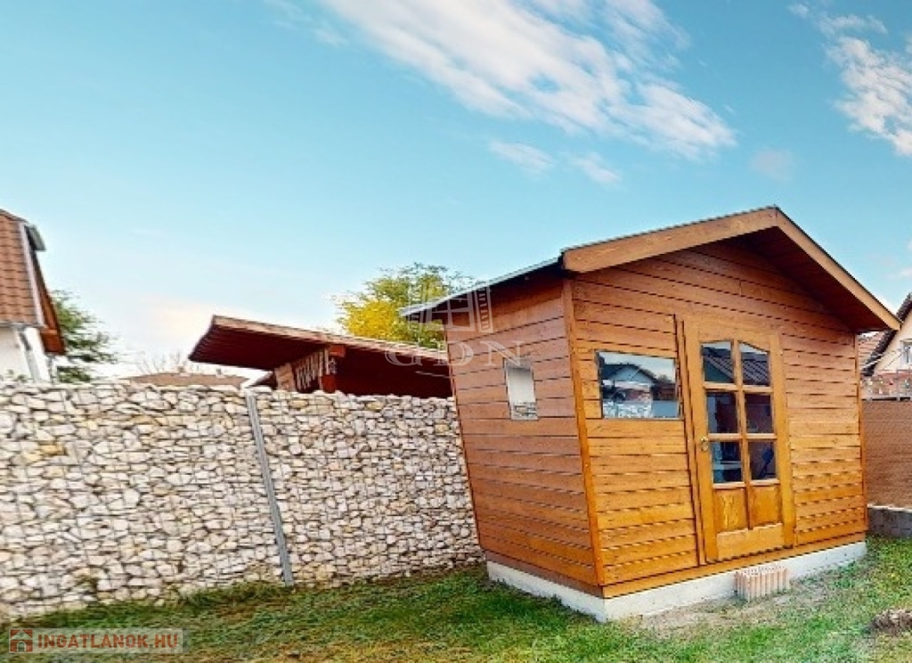 A kertbe elhelyezésre került egy 6 m²-es hőszigetelt faház elektromos padlófűtéssel, ami kerti tárolóként funkcionálhat.
