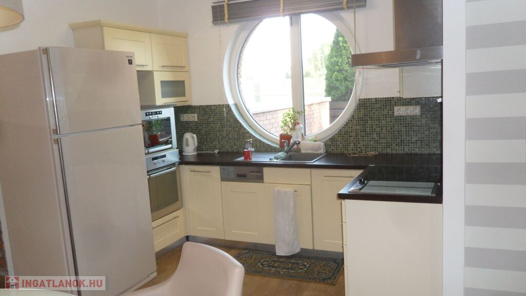 Bútorozva, teljes gépesítéssel, (mosogatógép, mikrohullámú sütő, mosógép szárítóval, porszívó stb). A konyhában beépített sütő, mikrohullámú, kerámialapos tűzhely, mosogatógép.