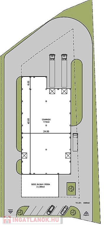 Ikrény ipari parkjában, 4.586 m2-es telken elhelyezkedő, 1.115 m2-es, 10 m belmagasságú, fűthető csarnok, 400 m2 irodafelülettel eladó: