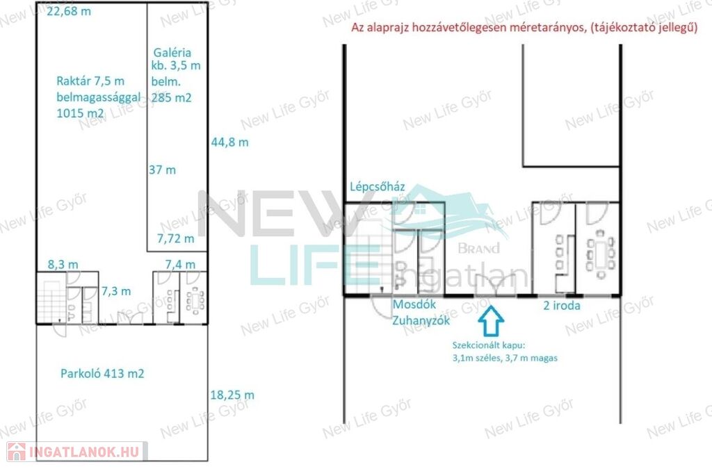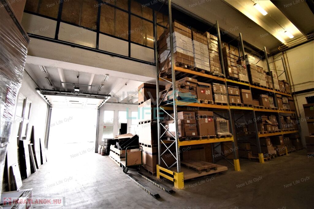 Győr Szabadhegy városrészében kiadó ipari, kereskedelmi, raktározási, szolgáltatói célra kiválóan alkalmas 1015 m2-es csarnoképület 7,5 méteres belmagassággal (+ 285 m2 galéria 3,5 m magassággal).