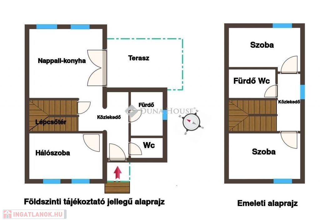 Az épületek teljesen egyformák, lakótere 75m2+18m2 terasz. A földszinti alapterülete 43m2+18m2 terasz, az emeleti alapterület 32m2. A földszinten szélfogó, fürdőszoba, különálló wc, nappali-konyha-étkező és egy hálószoba valamint a részben fedett terasz található. Az emeleten közlekedő, 2 db külön nyíló szoba és fürdő-wc található.