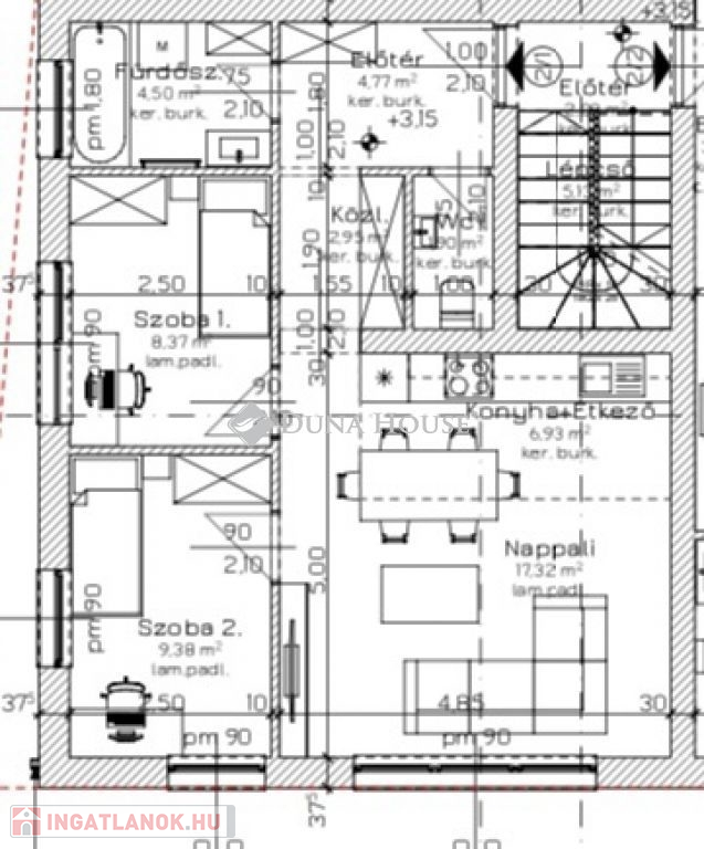 Kialakítása: 2 szoba, nappali+konyha étkező, előtér, közlekedő, fürdő, külön wc