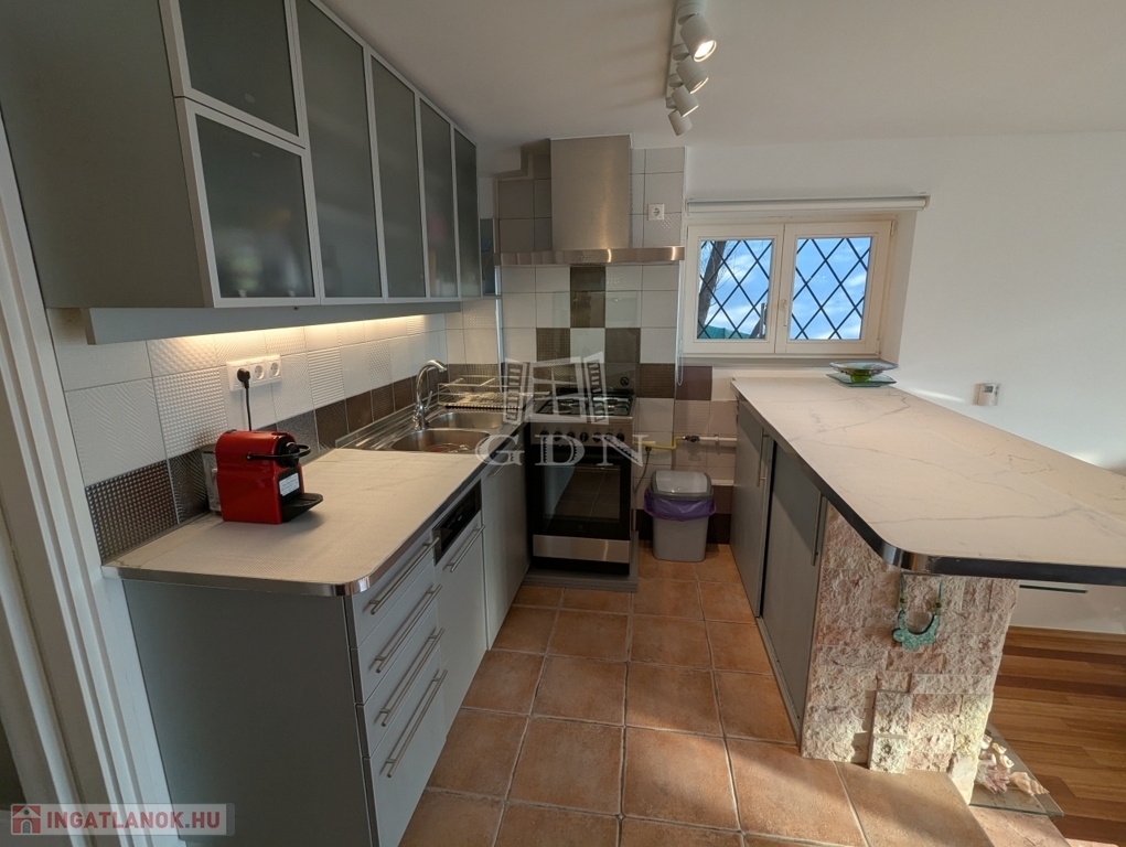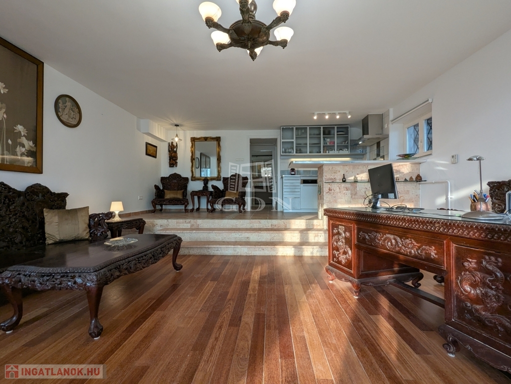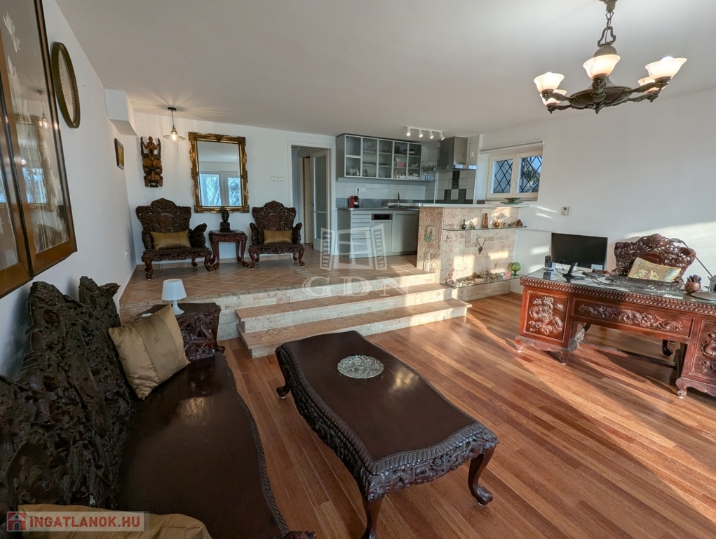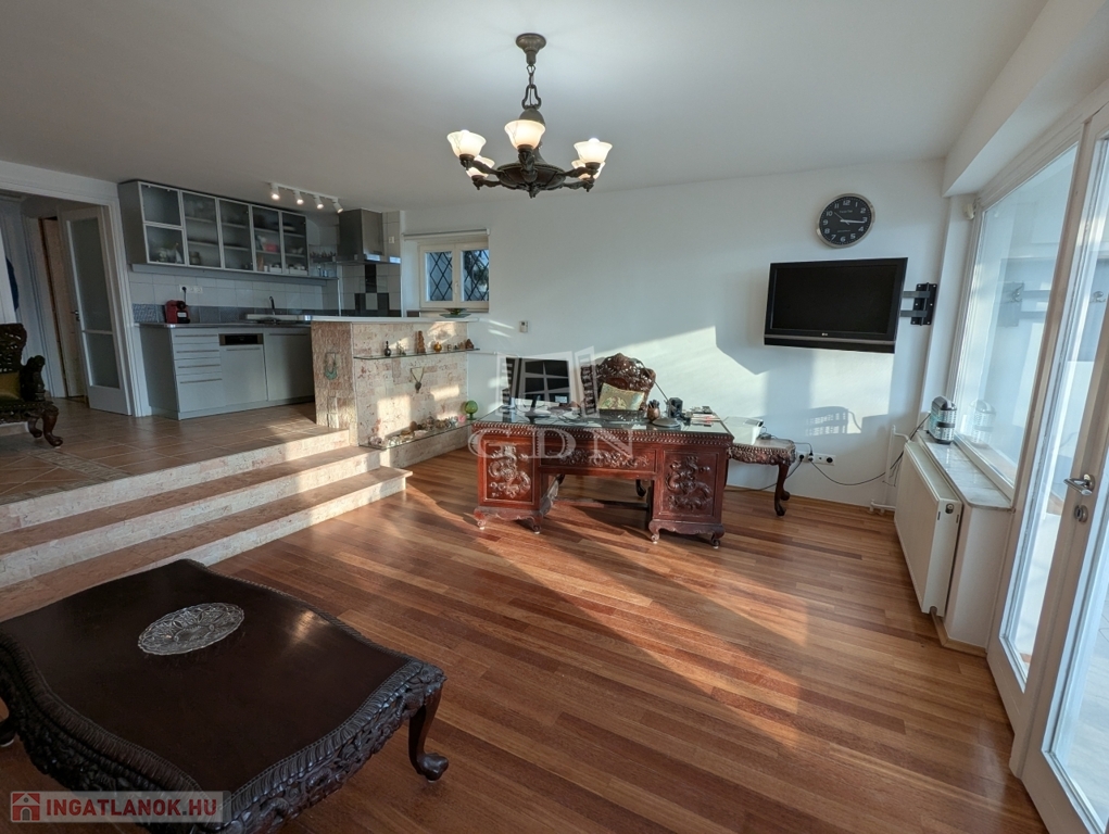 A konyha és étkező 3 lépcsőfokkal magasabban van, így különleges térérzetet ad.