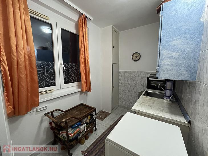 A konyha jól alakítható, praktikus méretű, nagy ablakának köszönhetően jól szellőztethető és világos. A fürdőszoba és a Wc külön helyiségben kapott helyet, a fürdőben öntöttvas kád található. A mosógép kiállása jelenleg nincsen kialakítva.