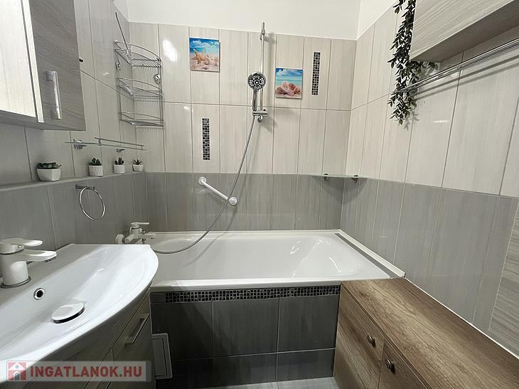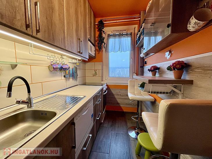 A konyha is teljesen megújult: új burkolatok, modern konyhabútor, beépített mosogatógép és egy kényelmes bár/reggeliző pult teszi teljessé a teret.