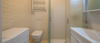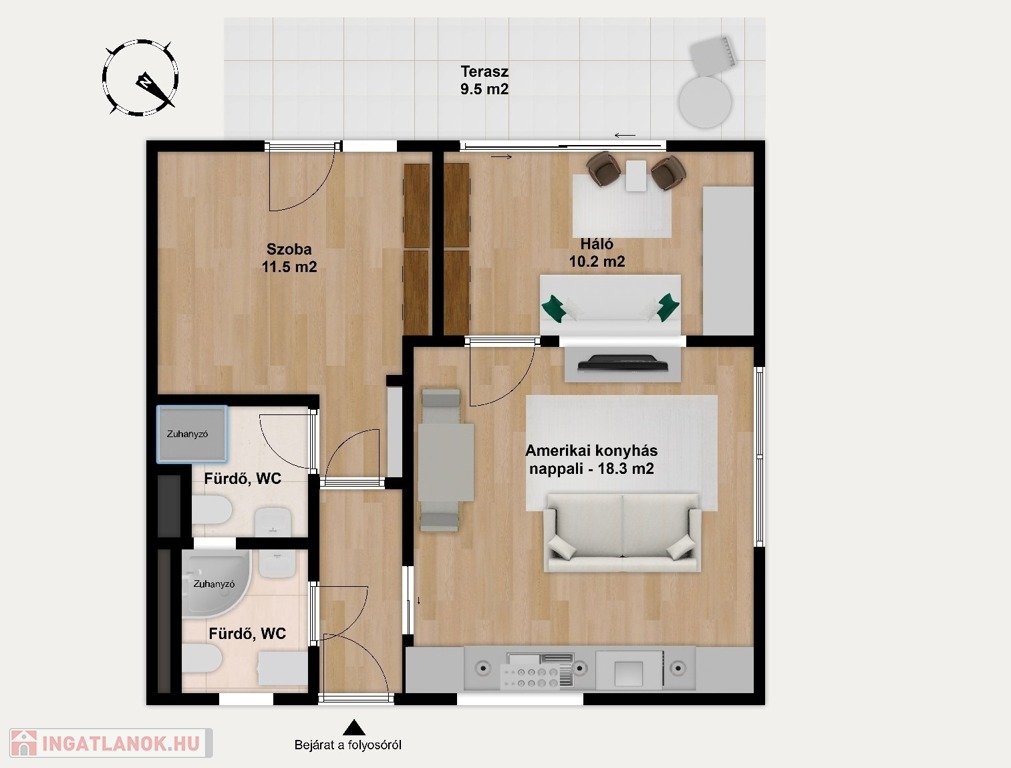 A lakás egyik legnagyobb előnye az átgondolt, ritkán elérhető elosztás: két külön nyíló hálószoba és két fürdőszoba, ami ebben a méretkategóriában kifejezetten különleges.