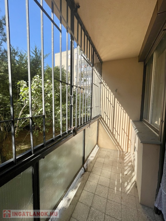 A nappaliból nyíló erkély csendes, parkosított területre néz, biztonsági ráccsal ellátott. A konyhához kamra is tartozik.