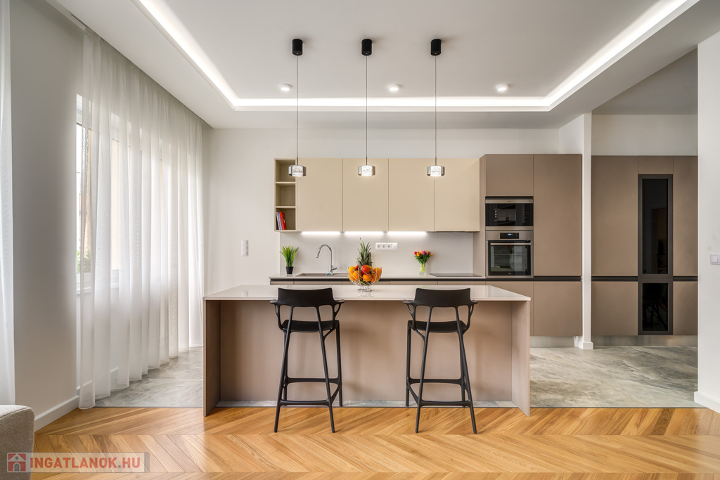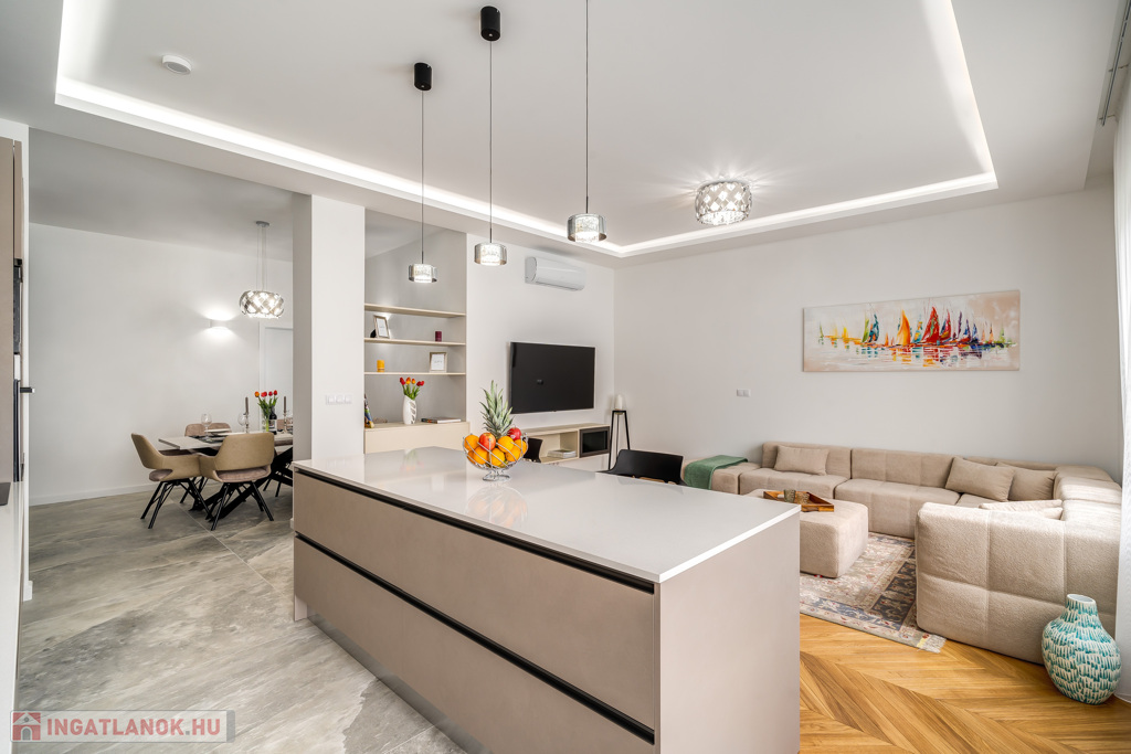 Tágas nappali, étkező, modern konyha, két hálószoba, két fürdőszoba