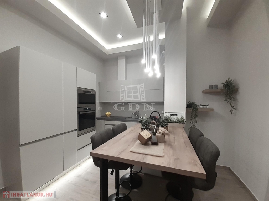 A teljesen felszerelt, egyedi tervezésű német konyha és a lakásban található minőségi bútorok a vételár részét képezik.