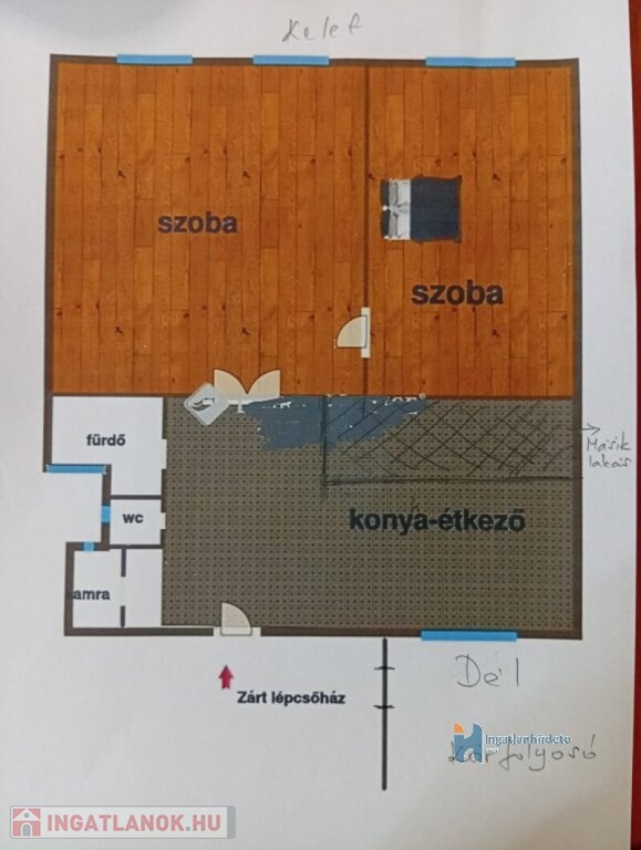 Elosztás: előszoba, amerikai konyhás nappali, 2 hálószoba, fürdőszoba, külön WC, kamra