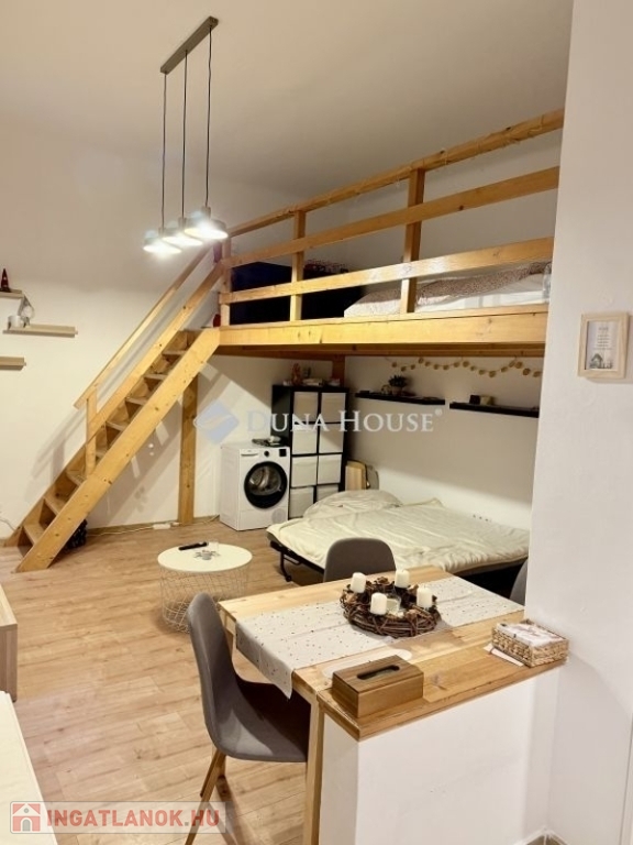 .A lakás 3,5 méteres belmagasságának köszönhetően galériázott kialakítást kapott, így a tér kihasználása kiváló ideális választás első lakásnak, fiataloknak, egyedülállóknak, vagy befektetésnek kiadásra.