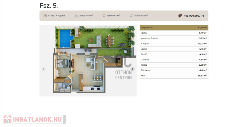Ez a földszinti kertkapcsolatos lakás 62,45 nm-es, nappali-étkező-konyha +1 szobás, 8,8 nm-es terasszal és 67 nm-es kerttel.