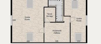 Az emeleti szinten, 2 tágas hálószoba és egy közlekedő került kialakításra. Továbbá található egy jelenleg tárolóként funkcionáló, de fürdőszobának előkészített helyiség is.