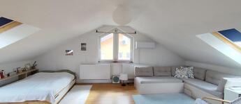Családi házas övezet csendes zsákutcájában, 2 lakásos épületben, emeleti, napos, belső két szintes lakás saját kertrésszel és gépkocsi beállóval.