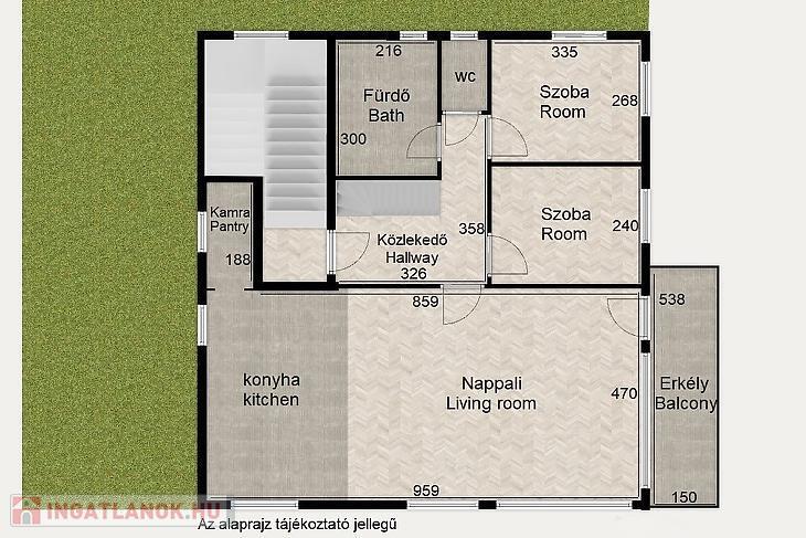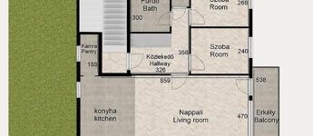 A bejárati szint központi helysége egy napos, erkélykapcsolattal is rendelkező, nagyméretű amerikai konyhás nappali. Szomszédságában találjuk a kényelmes méretű, káddal szerelt fürdőszobát, egy külön wc-t, a tárolást könnyítő kamrát és 2 hálószobát.