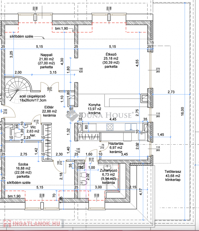 Elosztását tekintve:- Tágas előszoba- Fürdőszoba- Háztartási helyiség- Külön mellékhelyiség- 1 hálószoba - Tágas és világos amerikai konyhás nappali 43 m2-es teraszkapcsolattal