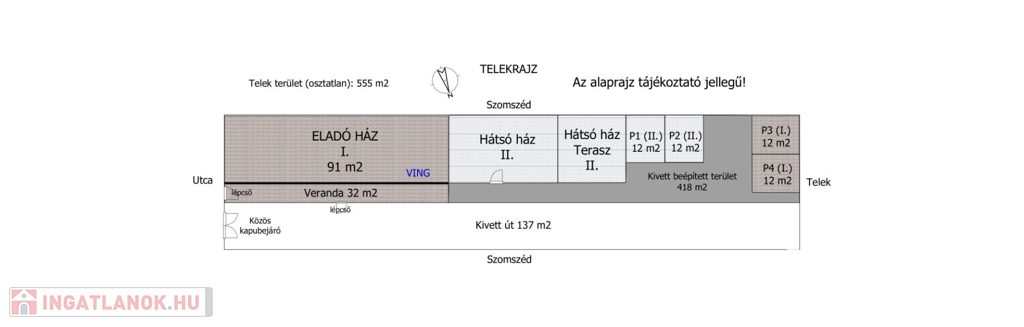 A fenti lakás egy másik lakással együtt közös udvaron található 555 m2-es összközműves telken.