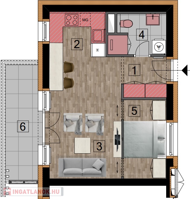 nappali-étkező-konyha -háló egy légtérben, fürdőszoba, közlekedő.