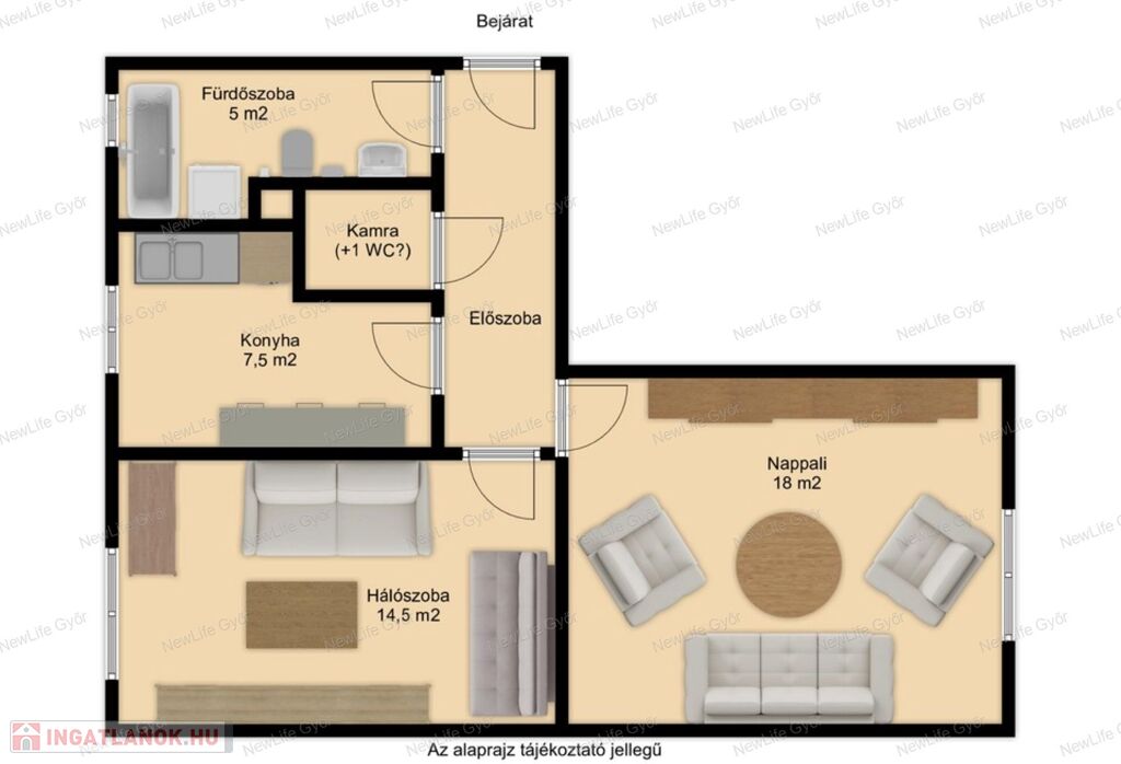 Elosztása: tágas nappali, nagyméretű hálószoba, konyha, kádas fürdőszoba WC-vel, egy kamra (ahová akár a WC áthelyezhető), közlekedő.