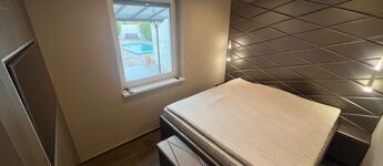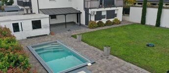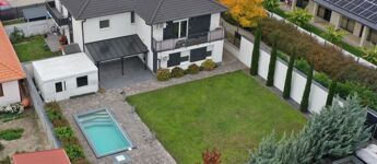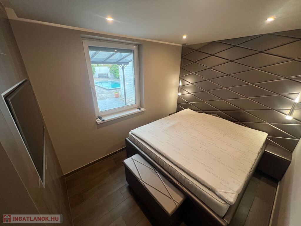 Kiemelkedően igényes környezetben, 61 m²-es, 2 szoba + nappalis lakás eladó, 350 m² saját kerttel, 25 m² terasszal, medencével, 20 m²-es kerti faházzal és 2 gépkocsibeállóval.