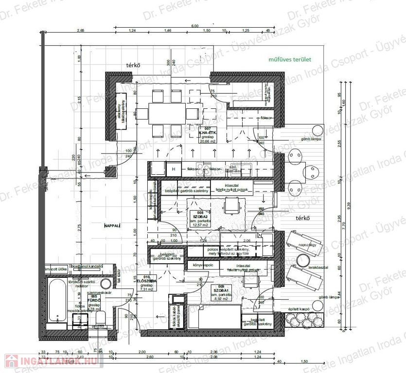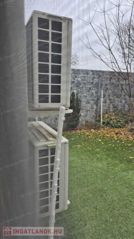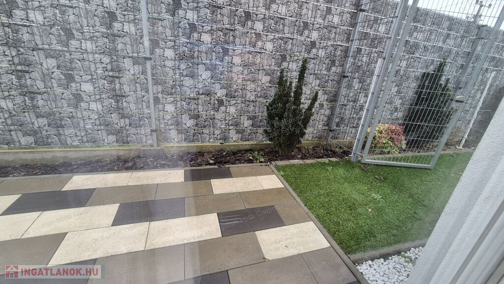 35 m²-es térköves teraszt, gondozott, műfüves, parkosított, körbekerített udvart.