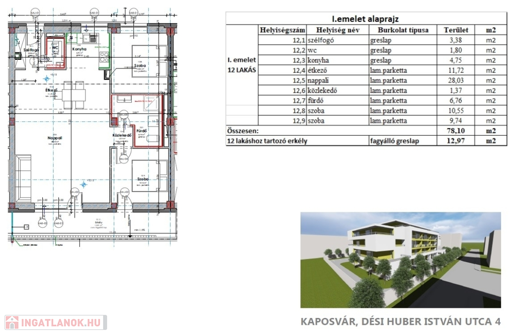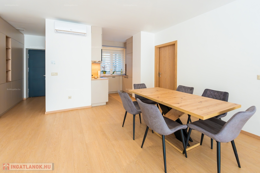 Kaposváron a belvárosban, a Dési Huber utcában - a kórház közelében - igényes kivitelben épült, modern architektúrájú 30 lakásos, új társasház 1. emeletén, 79 m2-es lakás 14 m2-es erkéllyel együtt eladó. A lakásban nappali-étkező-konyha, 2 szoba, közlekedő, szélfogó, fürdőszoba-wc, wc helyiségek kerültek kialakításra. Az épület korszerű energetikájú, a lakás fűtés levegő-víz hőszivattyús Nibe fűtésrendszerrel - padlófűtéssel, a fürdőszobában elektromos törölközőszárító radiátorral biztosított, továbbá a lakás hűtése Gree típusú Fan-coil rendszerrel történik, a fürdőszobában magas minőségű Wellis szerelvények kerültek beszerelésre. A lakás fűtéséhez, vagy hűtéséhez szükséges villamosenergiát az épület tetején elhelyezett napelemek biztosítják, a társasházban központi vízlágyító berendezés is beszerelésre került. A lakáshoz igény esetén 3.000.000.- Ft-ért az épület zárt udvarában 1 személyautó részére parkolóhely megvásárolható! Az ingatlan megvásárlásához CSOK igényelhető!