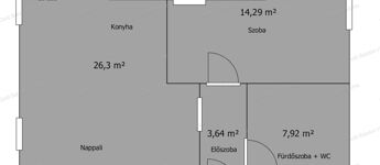 - alapterület: 46 nm: előszoba, nappali - konyha – étkező, hálószoba, fürdőszoba + WC, erkély