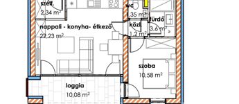 A 1 db amerikai konyhás nappalival, 1db hálószobával, 1 db fürdőszobával, közlekedővel, loggiával rendelkezik.
