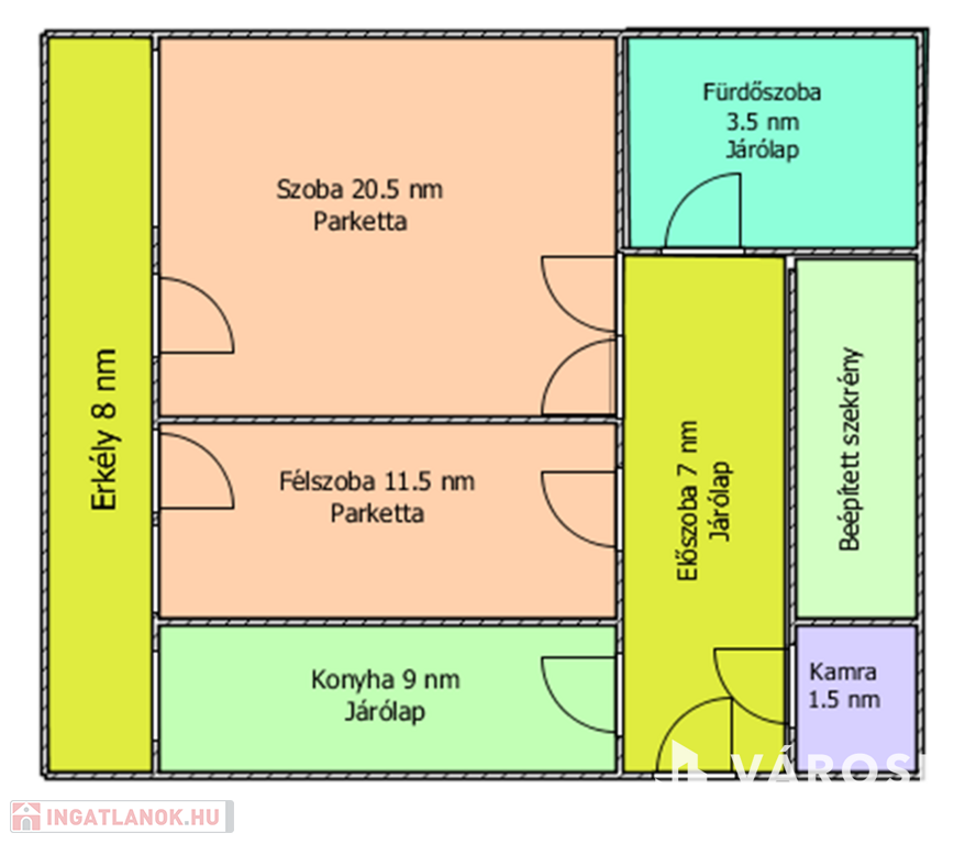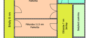 Az ingatlanban nappali, hálószoba, konyha, előszoba, kamra, fürdőszoba, erkély (8 nm) található.