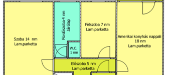 Helyiségei: 1 szoba, 1 félszoba, amerikai konyhás nappali, kamra, fürdőszoba, külön nyíló W.C., előszoba, erkély.