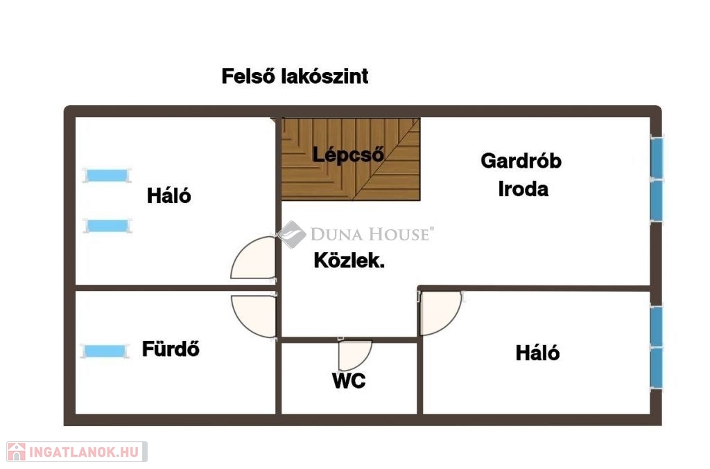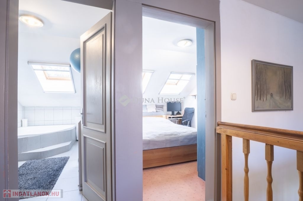 Az emeleten 3 háló, egy fürdő és egy második szeparált WC kapott helyet. Az egyik háló nem lett leválasztva a közlekedőtől, ezt irodaként/gardróbként használják a jelenlegi lakók, de könnyedén, egy gipszkarton fallal megoldható a 3. háló kialakítása is, ahogy az az eredeti tervrajzon is látható.
