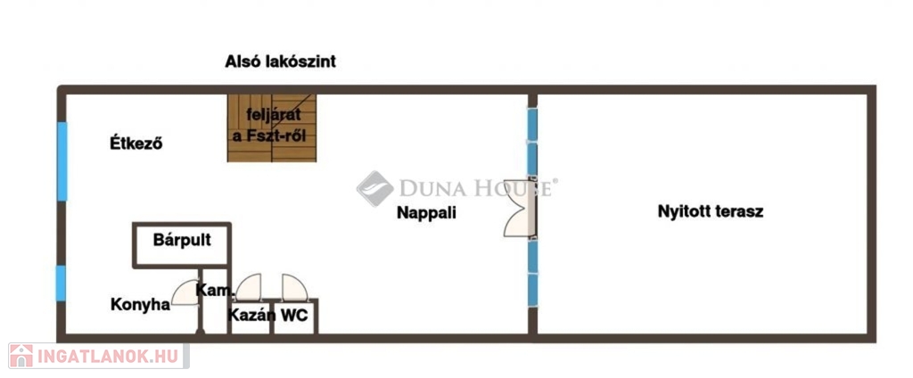 A lakás alsó szintje egy légterű, nyitott, ezáltal világos, jól átlátható és szellőztethető. A nappalit és az étkező-konyhát egy közlekedő választja el egymástól, ahova a WC és a kazánház/tároló nyílik, a konyhából pedig egy kis kamrát is leválasztottak.