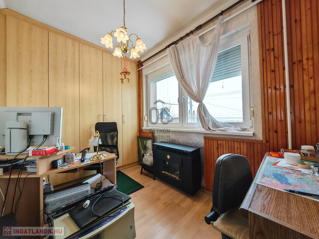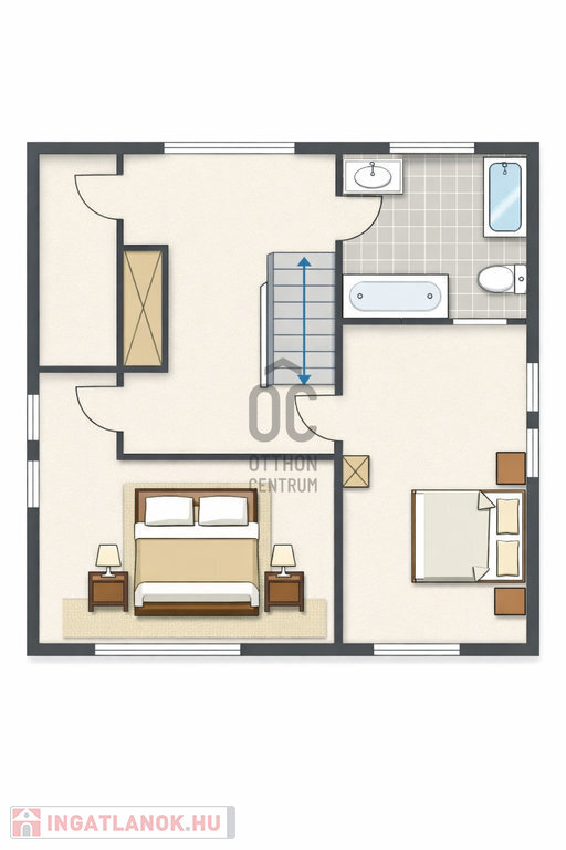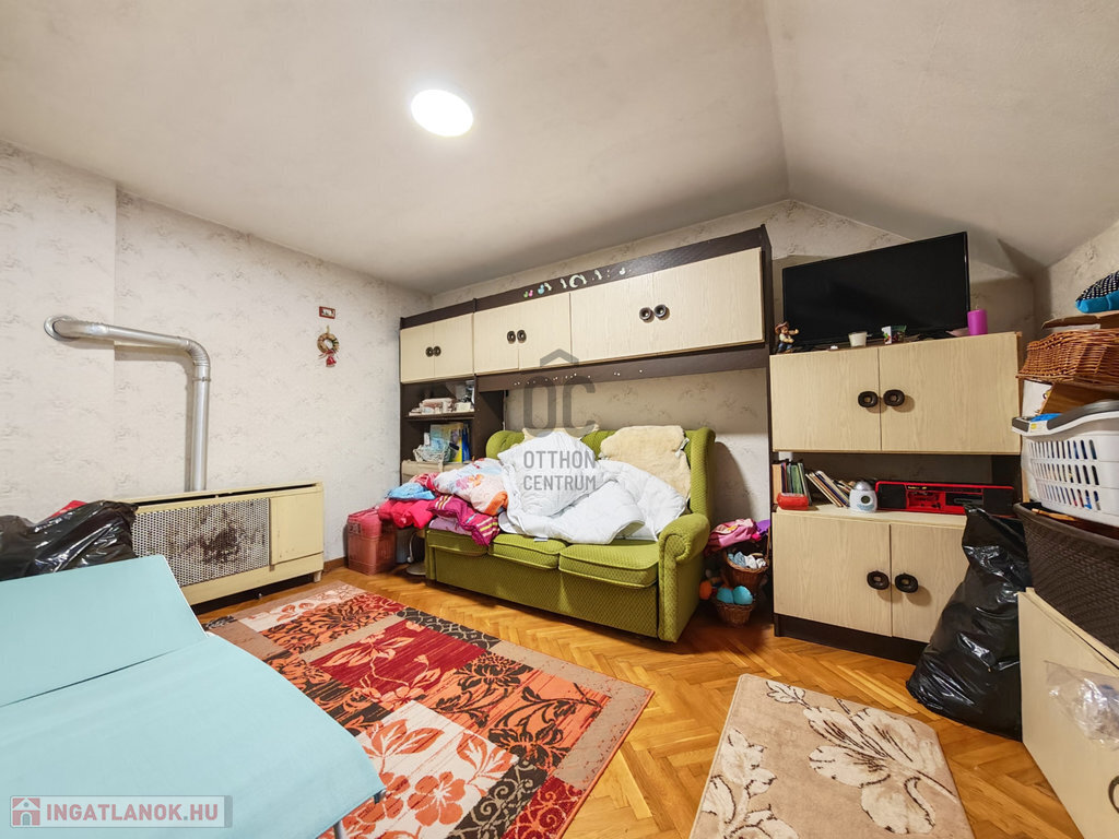 Emelet: közlekedőből nyíló két különálló szoba, egy második fürdőszoba WC-vel, illetve egy jelenleg beépítetlen padlástér