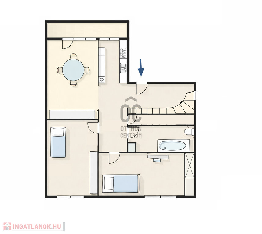 Földszint: tágas előszoba, konyha, nappali–étkező, kamra, fürdőszoba WC-vel, valamint két világos szoba