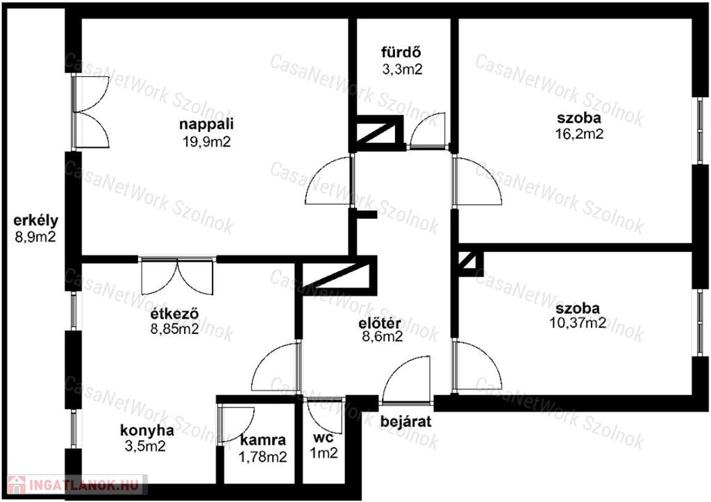 - 3 szoba, konyha, ebédlő, előtér, kamra, fürdőszoba, wc helyiségekből áll