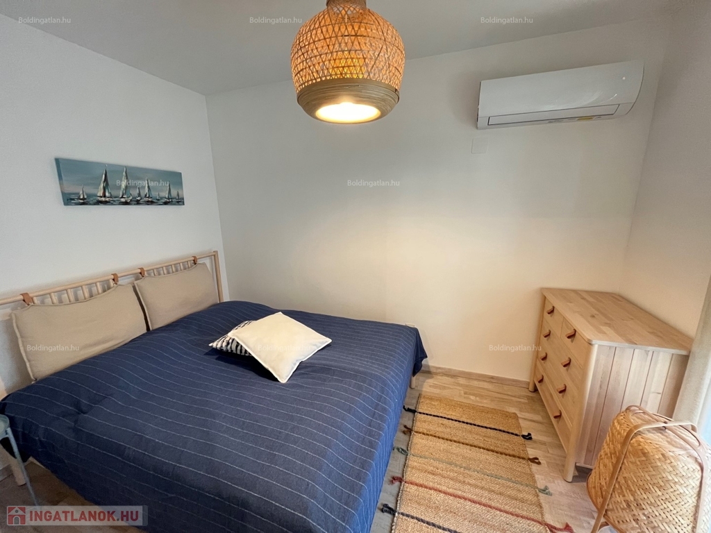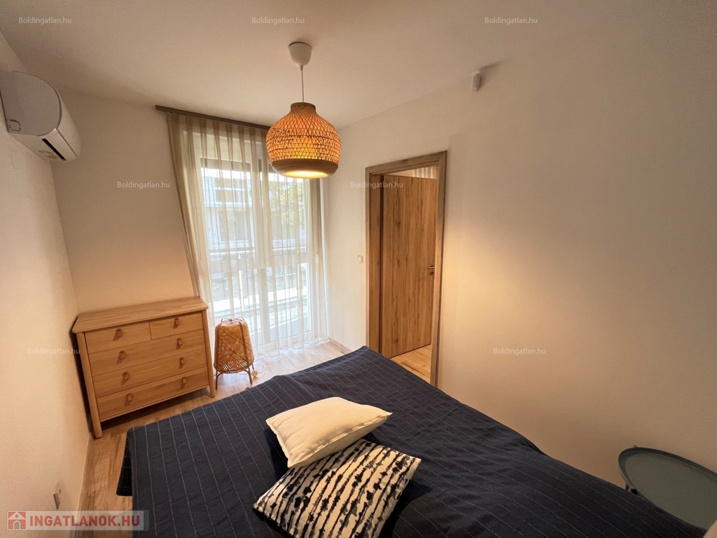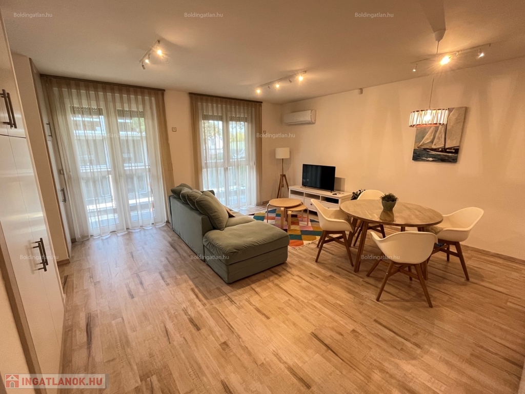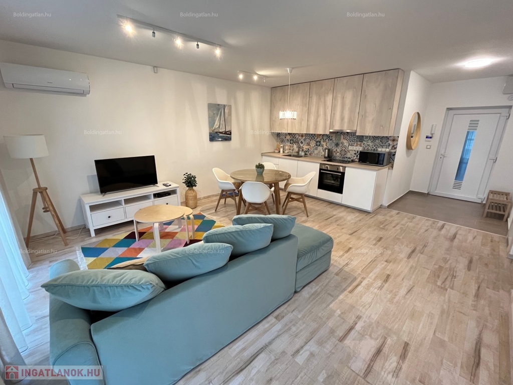 2026.05.31-IG!!! Balatonlellén a központ közelében, - a parttól nem messze - rendezett társasház 1. emeletén található, 48 m2-es - igényesen kialakított és berendezett - modern lakás kiadó. A lakásban előszoba-étkező-nappali, 1 szoba, fürdőszoba-wc helyiségek találhatóak, illetve a nappaliból kilépve nagy terasz is van. A fűtése légkondicionálokkal megoldott, továbbá riasztó is van felszerelve - a lakáshoz tartozik 1 db személyautó részére beállóhely is. A tulajdonos a lakást legfeljebb 2 felnőtt személy részére kívánja bérbe adni, a dohányzás és a kisállat tartása nem engedélyezett. Bérleti díj: 150.000.- Ft/hó + rezsi + 2 havi kaució