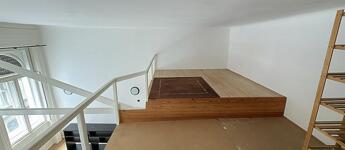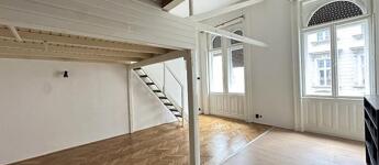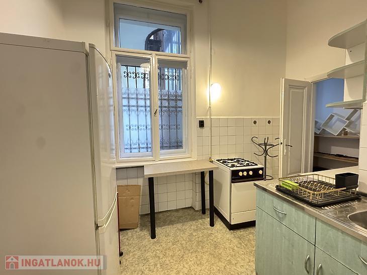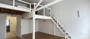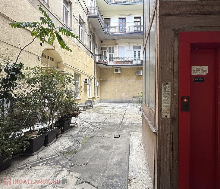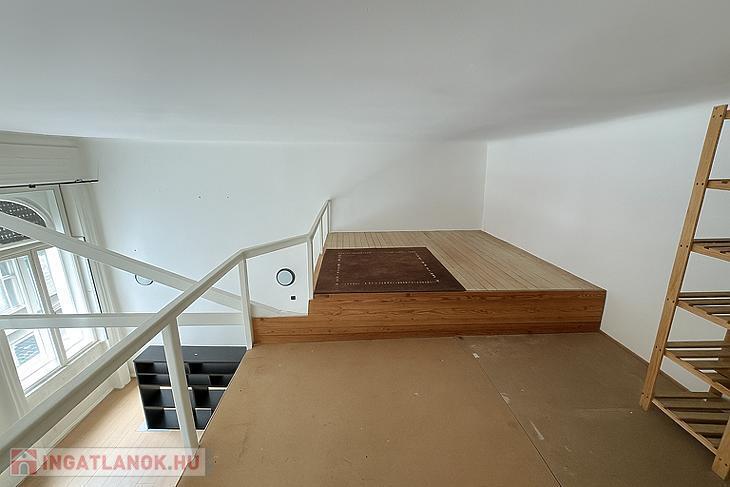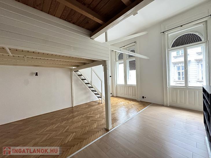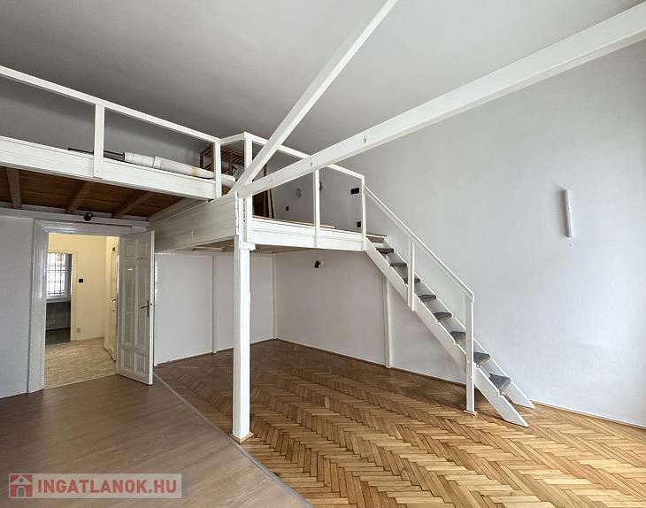 Kiadó egy világos, délnyugati tájolású, galériás egyszobás lakás a VI. kerületben, a Nagymező utca 37–39. szám alatti liftes téglaépület második emeletén.