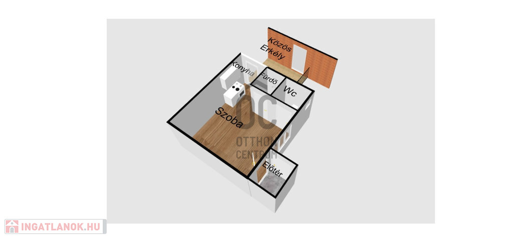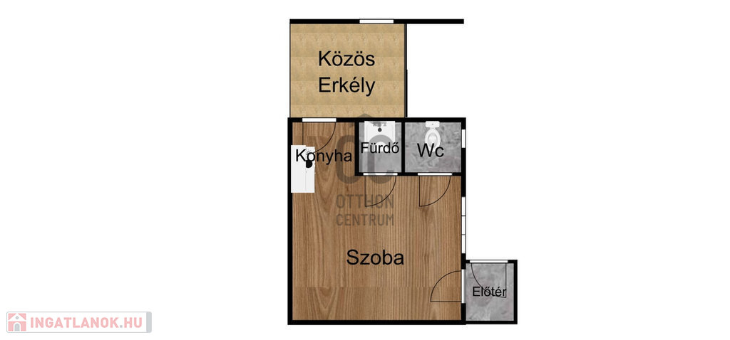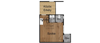 A lakás mérete 14,24m²-es + 7,2m2 közös erkélyes, elrendezése: előtér, konyha, fürdő, wc és egy szoba.