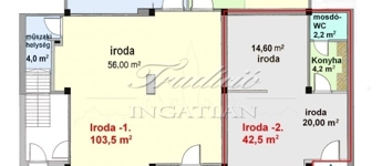 A 103,5 m2-es iroda elrendezése végett akár üzletnek, bemutatóteremnek is alkalmas lehet. A több helyiségből álló ingatlanban étkező-konyha, raktár, tárgyaló és vizesblokk is kialakításra került.
