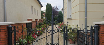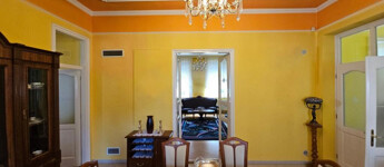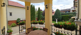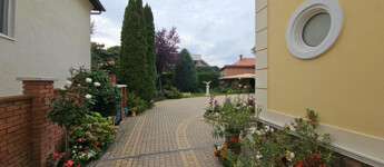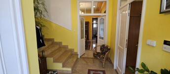A lakásban az étkező helyezkedik el középen, ide csatlakozik a délnyugati fekvésű, kert felé néző kellemes terasz, illetve innen nyílik minden további helyiség közvetve vagy közvetlenül. Van három tágas, keleti tájolású szoba - a szélső déli ablakkal is ellátva, - fürdő zuhanyzóval és káddal, külön WC, valamint a konyha. Plusz egy háztartási helyiség, ami részben mosókonyha, részben tároló, de itt kapott helyet a kazán és a bojler is. Mindhárom szoba megközelíthető külön is, de az első és a középső át is járható. Az első, délkeleti szobának önálló bejárata nyílik a lépcsőházból is, így akár iroda funkcióra is alkalmas. A nappaliként használt középső szobában van egy üvegfalú kandalló, ami nem csupán szép és jó hangulatú, hanem hasznosan egészíti ki a cirkós fűtést. Minden külső nyílászáró SCHÜCO tip., hőszigetelt üvegezéssel, redőnnyel. A lakás alatt több részből álló pince, hátul dupla garázs és melléképület áll rendelkezésre, ezek összesen 209 m2-et tesznek ki (lakótér: 128,54 m2, terasz: 13,31 m2, pince: 28,14 m2, garázs és tárolók: 39 m2). A telek 630 m2, a garázsokig térkövezve, egyébként gyeppel borított, szépen parkosított. Mind a lakás, mind a kert kiváló állapotban vannak. A 3 fázis vételezése mind az udvaron, mind a garázsban rendelkezésre áll. Elsősorban Pécsen vagy környékén építési telket, családi házat értékegyeztetéssel beszámítunk kizárólag olyan helyen, ahol van vezetékes internet. Az emeleti lakás, amely kizárólagosan önállóan a lépcsőházból közelíthető meg, a földszinti lakás eladása mellett meghatározatlan időre bérbe vehető (a földszinti lakás vásárló prioritása mellett). A kiadó lakás az emeleten 171 m2-es, négy lakószoba + étkező + konyha, kamra, fürdő, külön WC kialakítású, jellegében a földszinti lakással azonos azzal az eltéréssel, hogy a nyugati fekvésű, kertre néző 20 m2-es étkezőhöz terasz csatlakozik, a keleti tájolású 28 m2-es nappali szoba és a déli tájolású, kertre néző 35 m2-es nagyméretű dolgozó szoba franciaerkély kapcsolatos.
