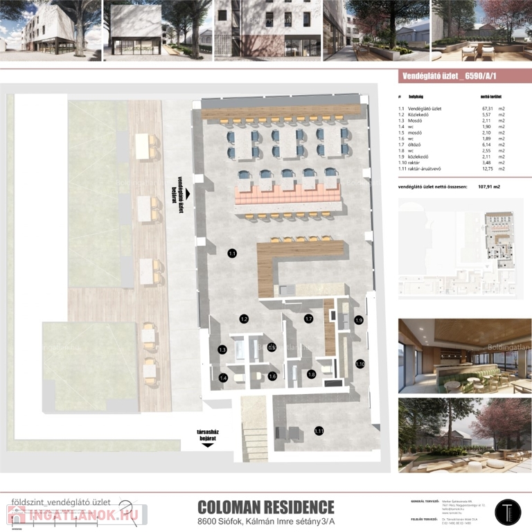 Siófokon a Fő térnél, a Kálmán Imre sétányon, új építésű, korszerű társasház földszintjén található 107,91 m2-es modern, vendéglátó üzlethelyiség eladó. A minőségi anyagokból készült ingatlanban egy stílusos, 67,31 m2-es vendéglátó üzletrész található, amely igényesen lett kialakítva, nagy portálok nyílnak az épület belső udvarára. Az üzletben található még közlekedő - előtér, továbbá innét nyílik 2 db mosdó és 3 db wc is. Ezen kívül az üzlethelyiségben 16,23 m2-es raktár-áruátvevő helyiségek is találhatóak élelmiszerek, italok, vagy egyéb árukészletek tárolására. Az épület fűtése korszerű, DAIKIN levegő/víz hőszivattyúval került kivitelezésre, és légkondicionáló is felszerelésre került. Az üzlethelyiség könnyen megközelíthető és parkolási lehetőség is megoldott a közelben. Az ingatlan ideális lehetőség egy nívós kávézó, cukrászda, vagy egyéb üzlethelyiség részére. Az ingatlan vételára: 140.283.000.- Ft + ÁFA!