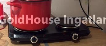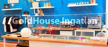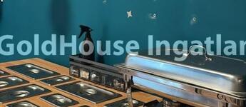 Berendezés: hűtő, mosogató, pult, székek, asztalok, elektromos pizzakészítő gép, szendvics és krumplisütő, rezsó, kávédaráló, kávégép, melegen tartó pult, állványok, egyéb konyhai eszközök.