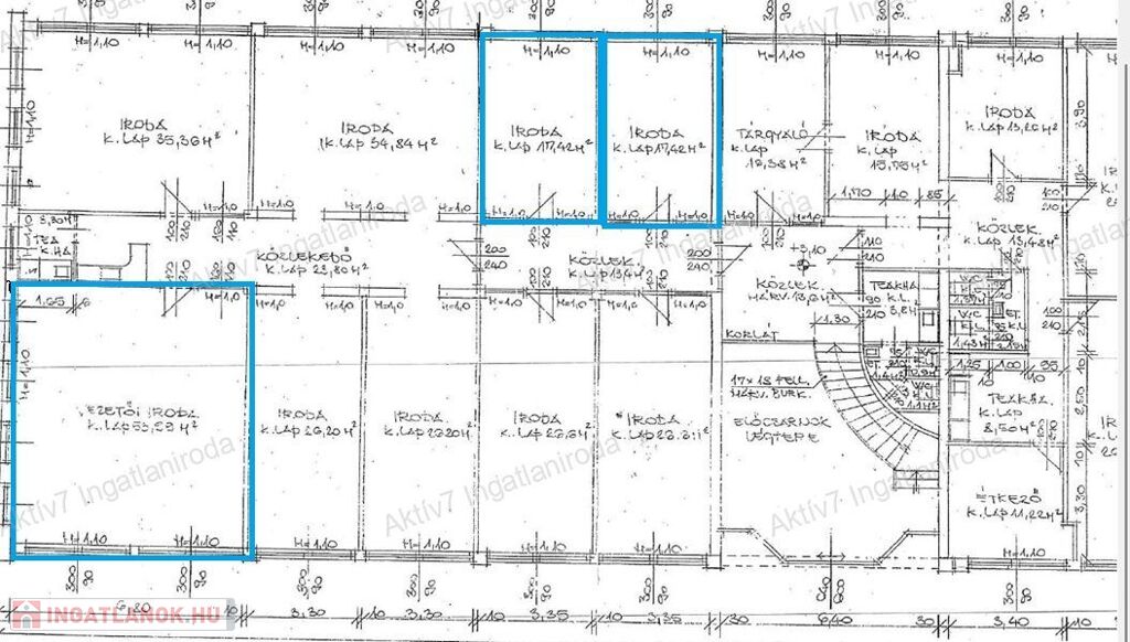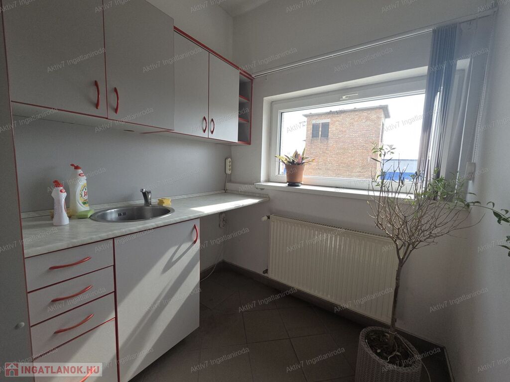 Az igényes és szép állapotú épület első emeletén az alaprajzon megjelölt irodák, egy 54 m2, és kettő 18 m2-es, közös használatú teakonyha és mosdó használattal.